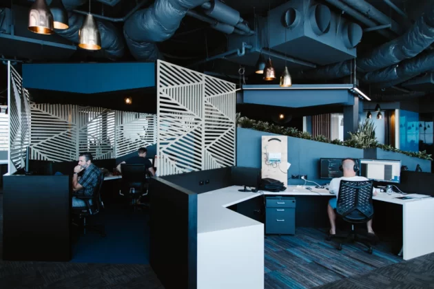 We suggested our Aus Screens, which are suitable for outdoor use in aluminum. They chose a custom pattern with 4mm aluminum painted in a special gold color for the exterior. For the interior office fit-out, they selected an MDF-based screen in 18mm, which we painted in the same gold color. The project included over 50 screens in total, with the external screens wrapping around the building and the internal screens dividing up the office space.