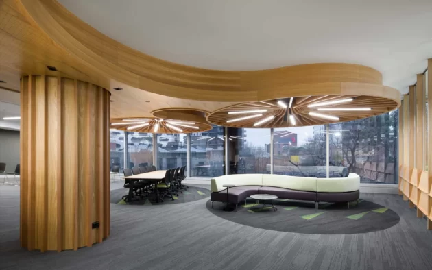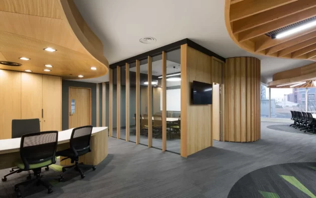 The final installation successfully met the project’s demanding specifications, providing a seamless and visually appealing finish. The precise grain matching and careful handling of the curved ceiling, columns, and services resulted in a high-quality, polished look that met the client’s expectations.