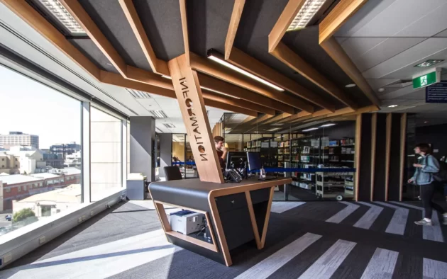We were tasked with a challenging project for the Melbourne University Law School, using Tasmanian oak panels from our Aus perforated range. The main difficulty was grain matching all the veneer for the length of the ceiling. Some panels were up to 2100mm in width, whereas most veneer sheets are only 1200mm wide. This required us to ensure everything lined up continuously with the grain while also following the curves of the ceiling.